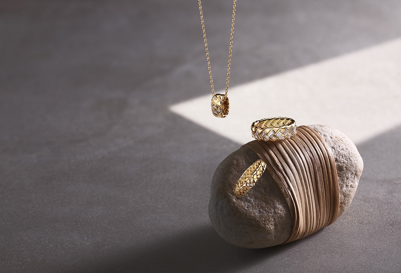 半歩先をいく女性の生き方をつくる、ベルシオラのパーパスを表現した「エレメント」コレクション。意志ある強さ=ハンサム、優雅さ=ミューズを併せ持つHANDSOMUSE(ハンサミューズ)の軸となる知性・洗練・自信・共感、4つのエレメントを編み込んだディテールで表現。立体感のあるイエローゴールドに添えられたテーパーバゲットカットダイヤモンドが、温かみのなかに静謐な輝きを放つ。前に踏み出す勇気としなやかさを持つ女性の思いを、未来へとつなぐストーリー性のあるジュエリー。