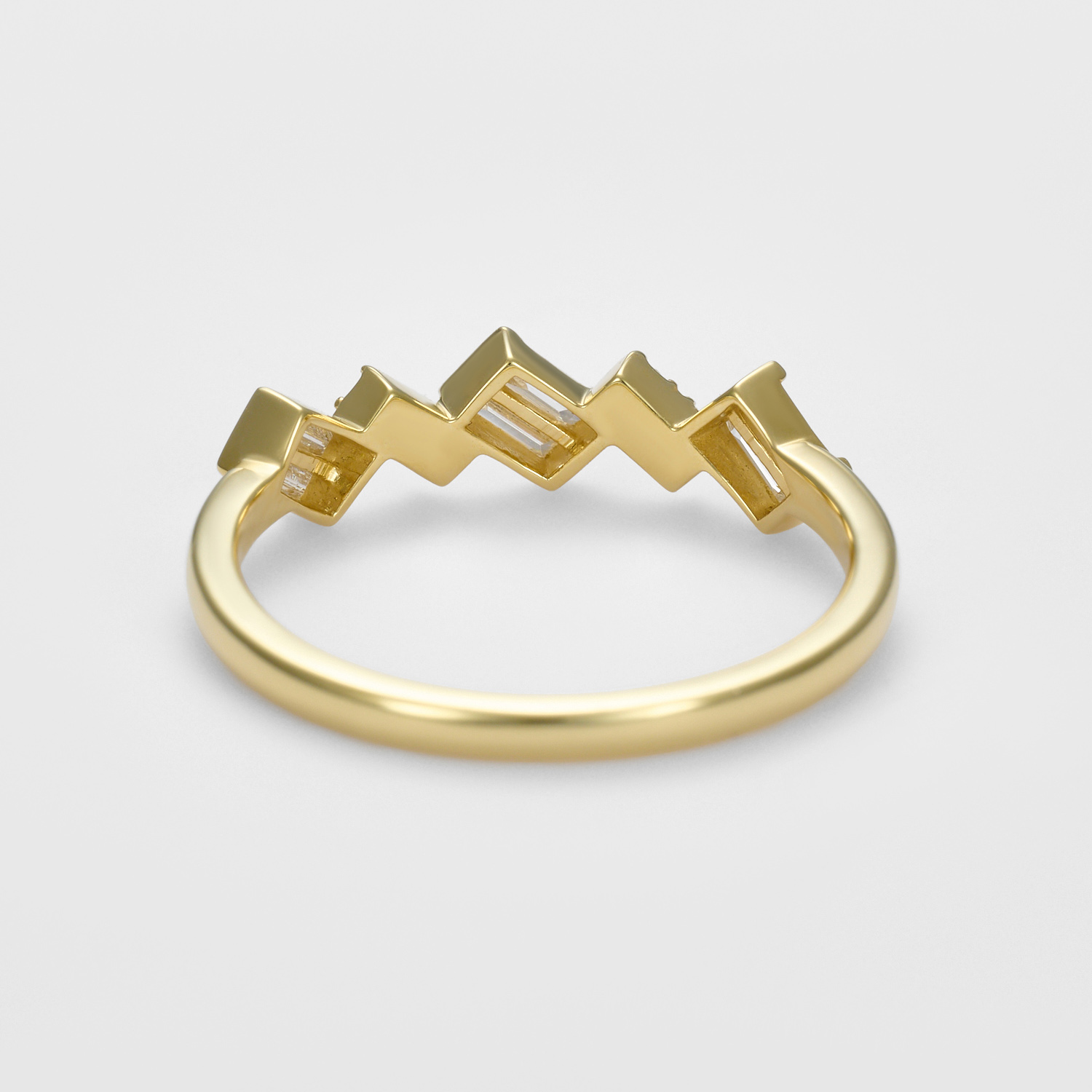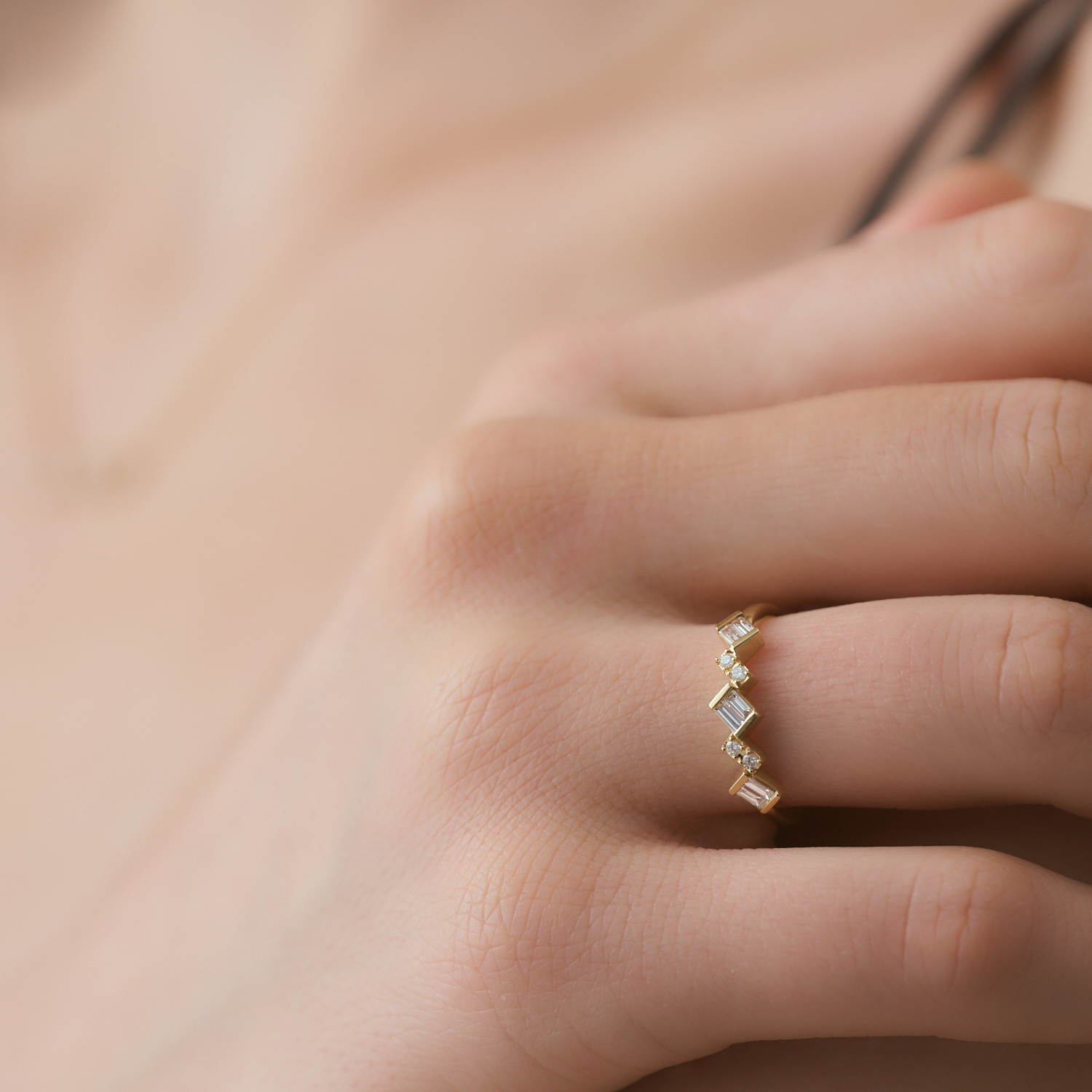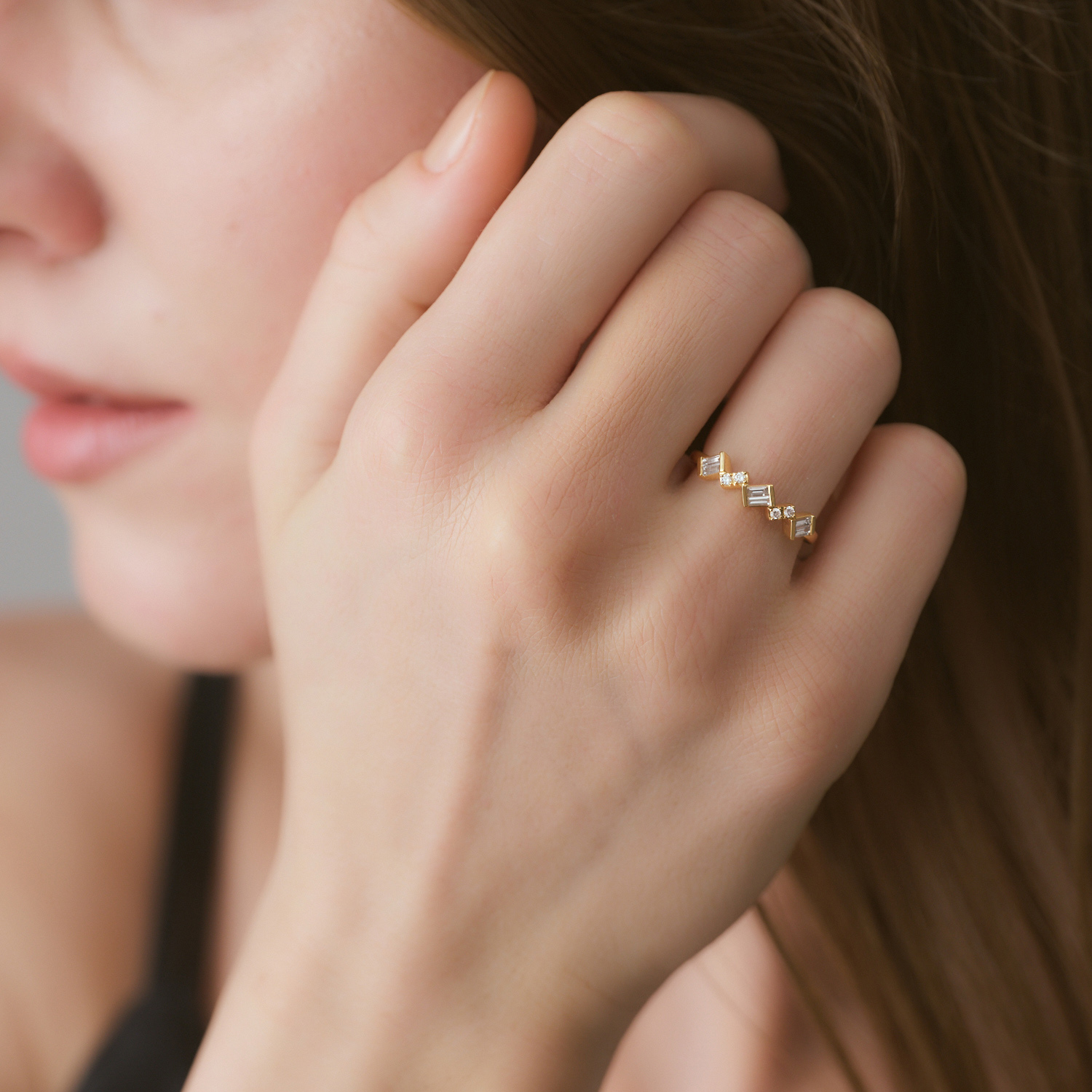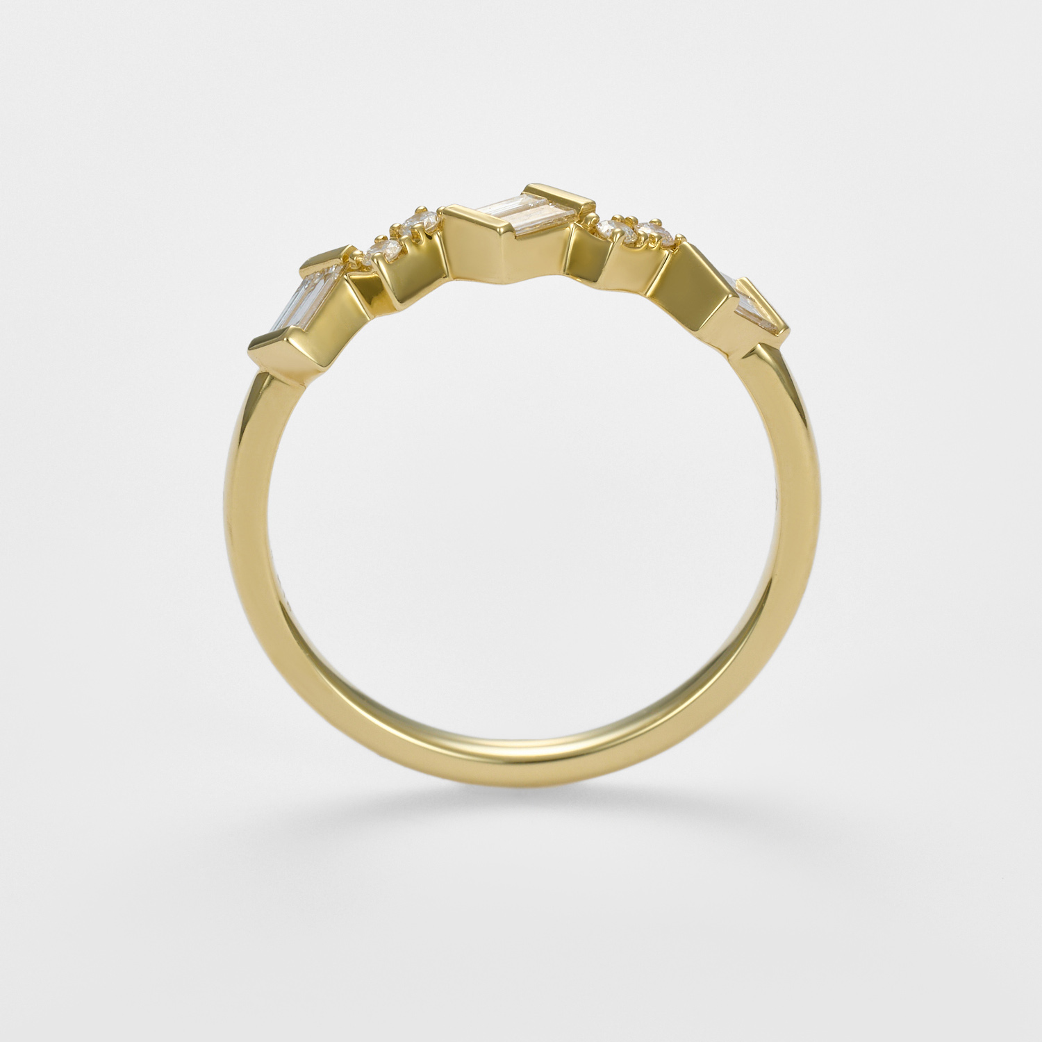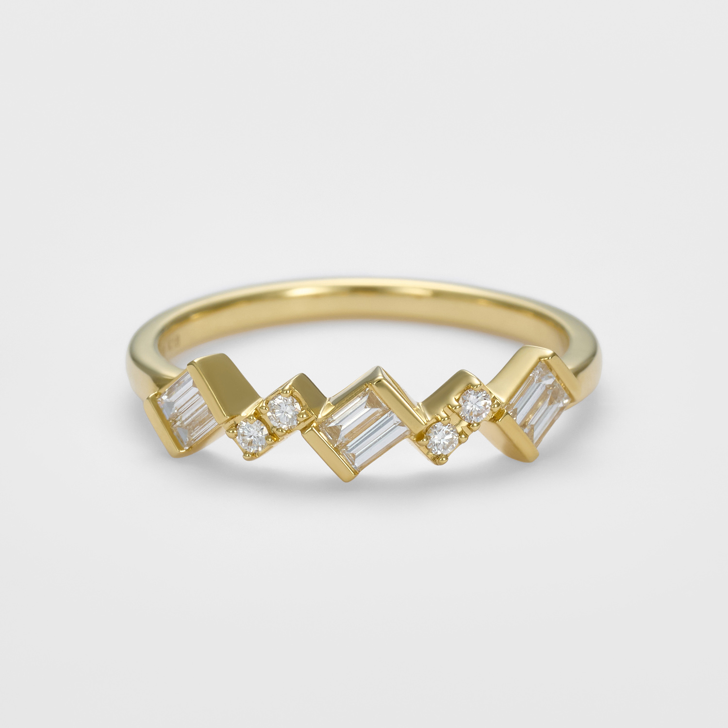 直線的で緊張感のあるバゲットカットと、やわらかな光を宿すラウンドブリリアントカット、ふたつのダイヤモンドがそっと解けていくように連なり、軽やかな流れを描きます。