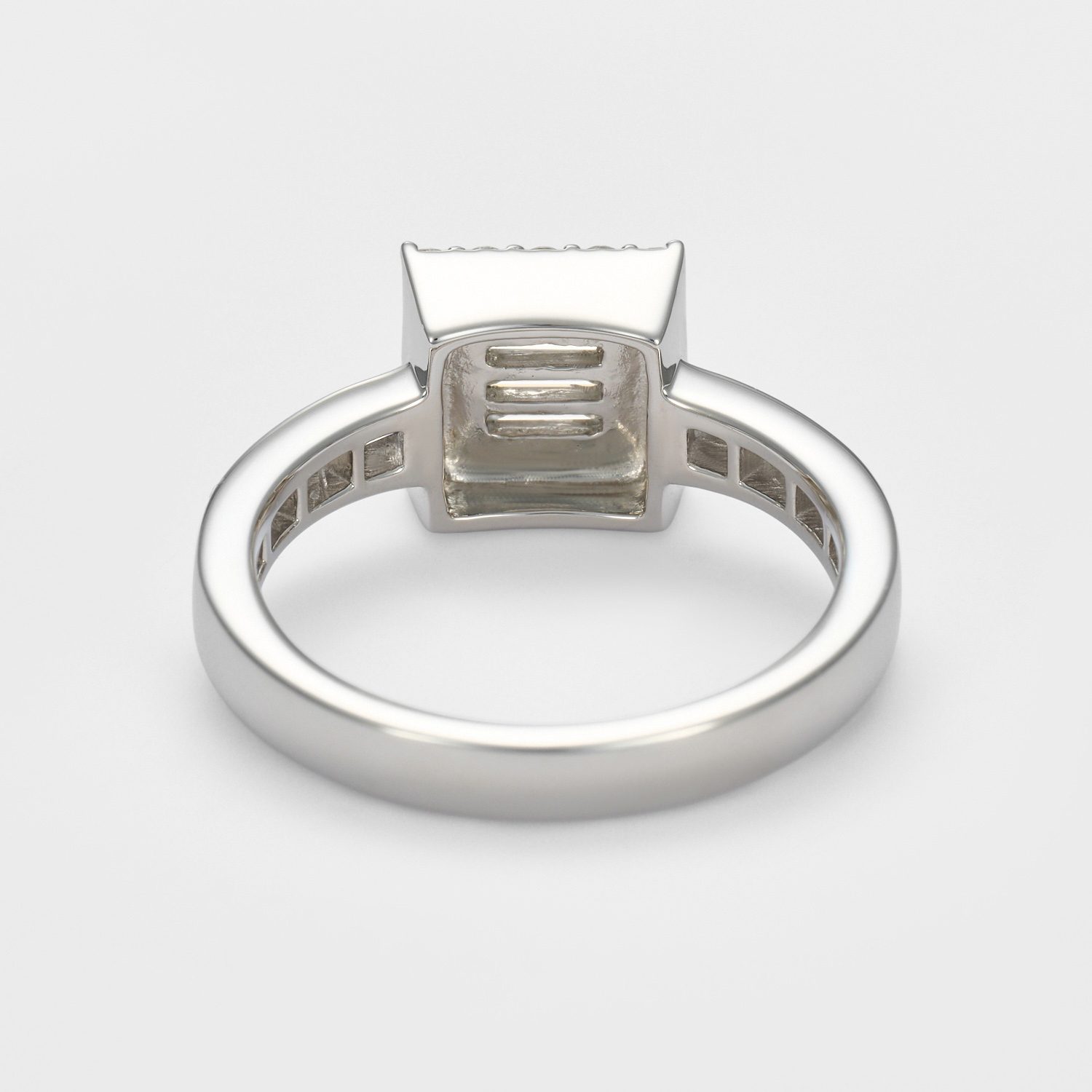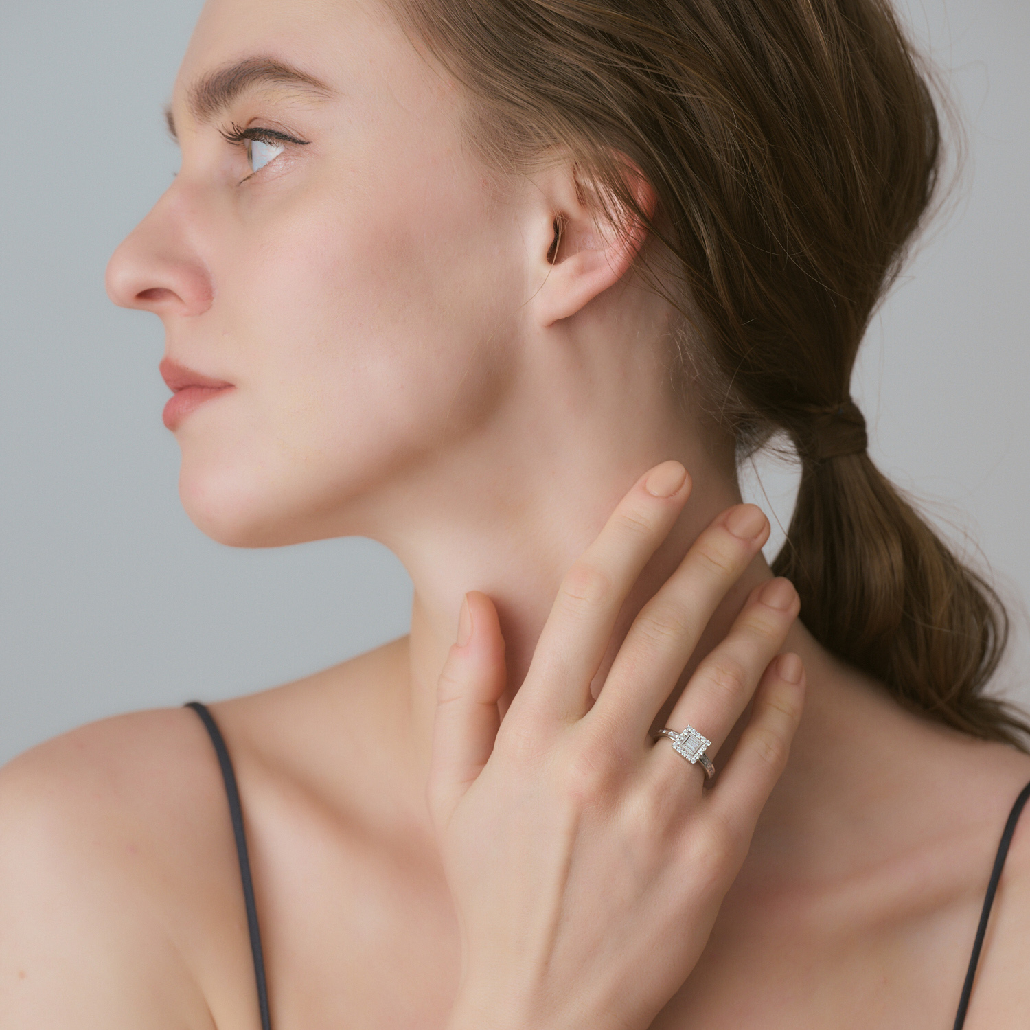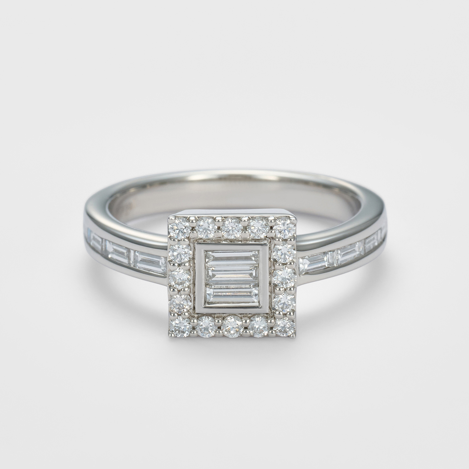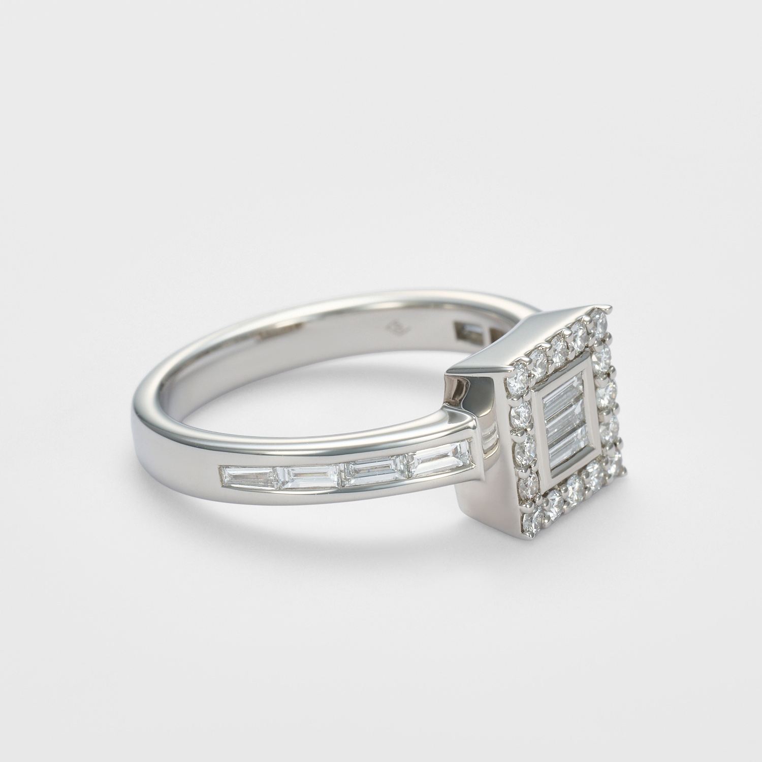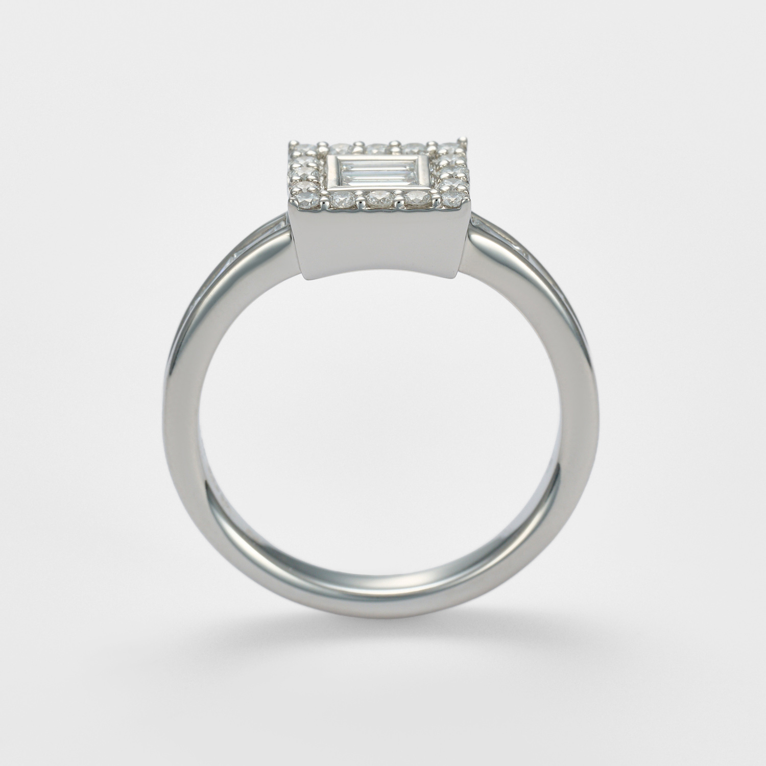 直線的で緊張感のあるバゲットカットをセンターに、やわらかな光を宿すラウンドブリリアントカットが静かに囲い込むように配したフレーム構造。