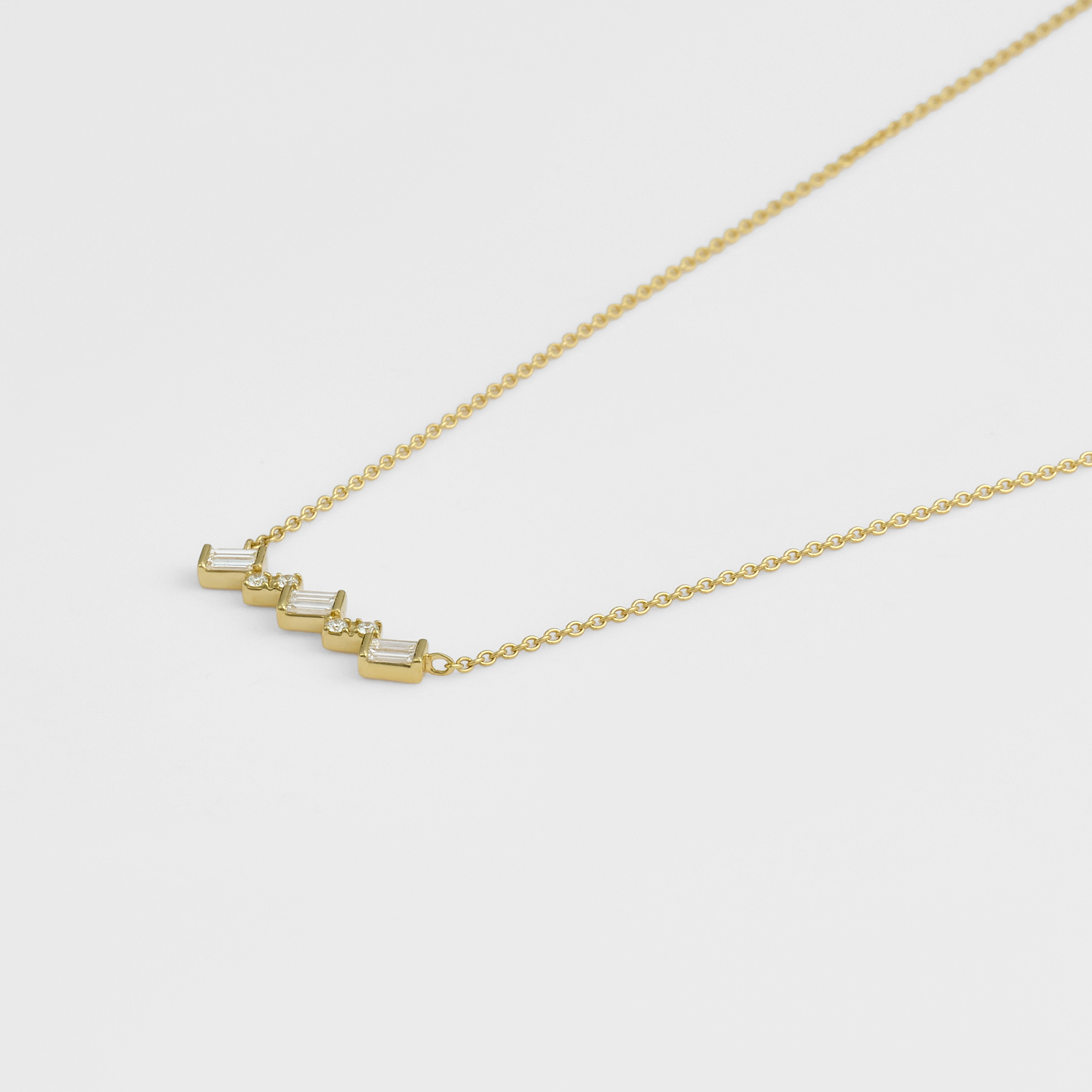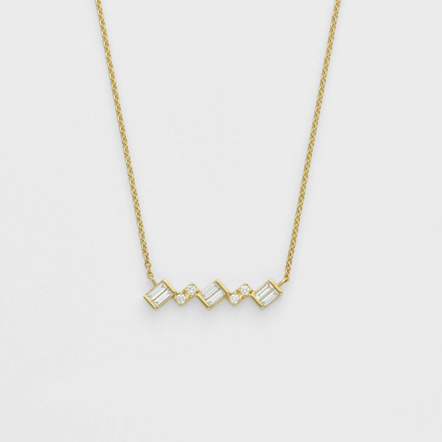 直線的で緊張感のあるバゲットカットと、やわらかな光を宿すラウンドブリリアントカット、ふたつのダイヤモンドがそっと解けていくように連なり、軽やかな流れを描きます。